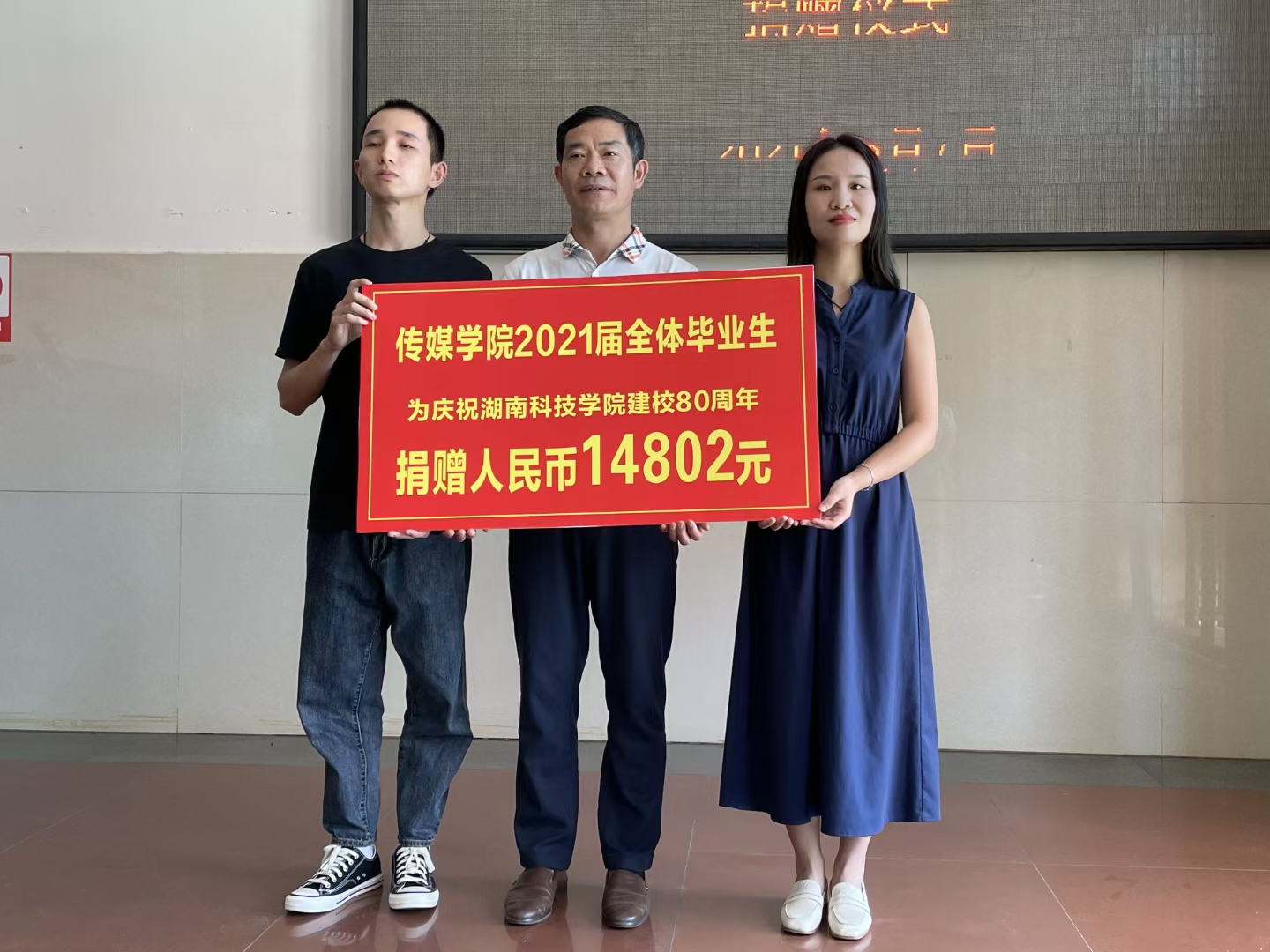 本网讯 6月7日上午,学校80周年校庆捐赠仪式在日新楼一楼举行,传媒学院2021届全体毕业生及永州市天顺科技驾驶员培训有限公司负责人自发为校庆捐款34802元,表达了对学校八十周年华诞的美好祝福。党委委员、副校长吴小林出席捐赠仪式。校友办主任杨能山主持仪式。