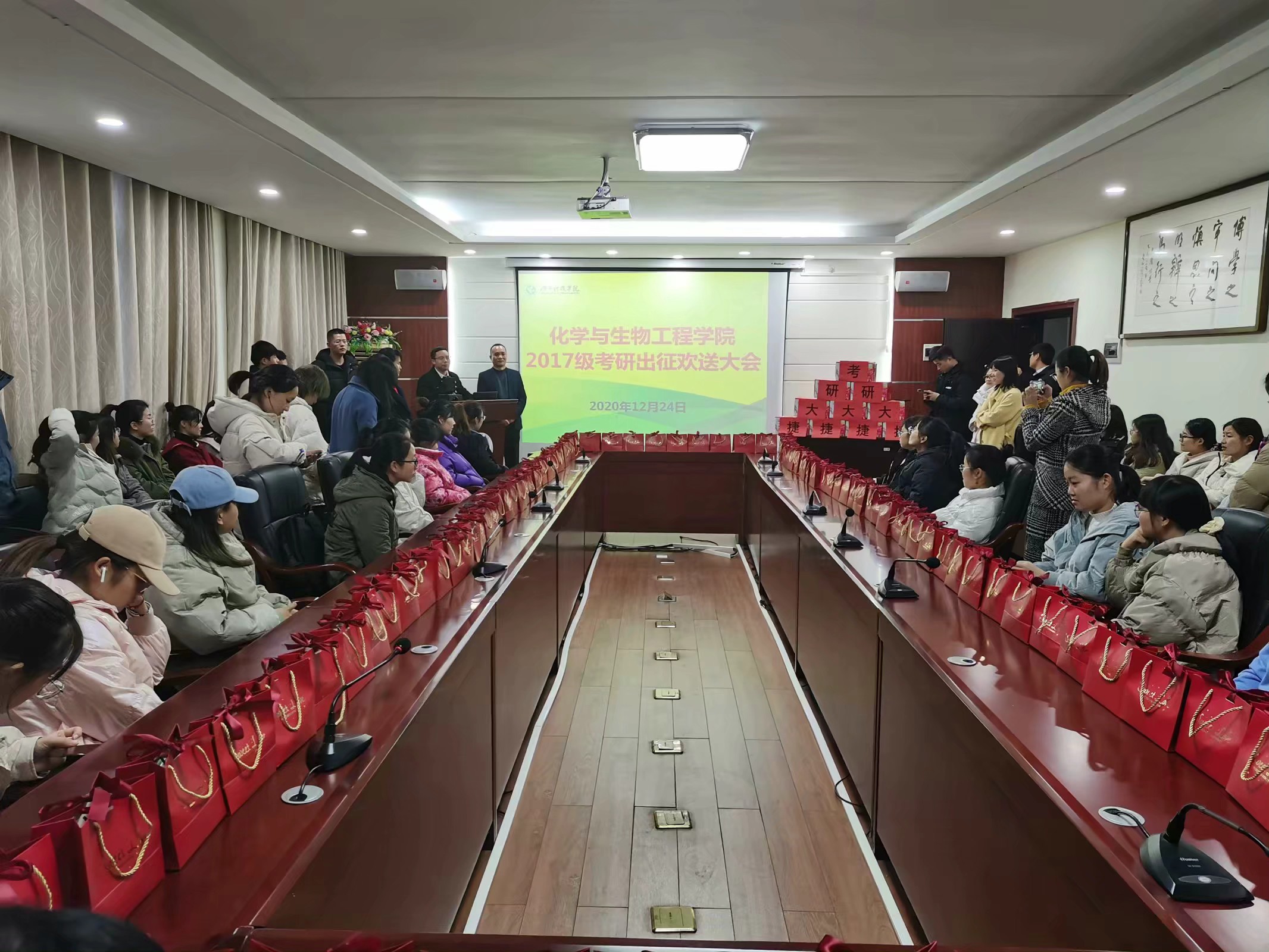 本网讯 2021年全国硕士研究生招生考试即将举行,为缓解同学们考试前的紧张心情,提振考试信心,12月24日下午,化生学院在逸夫楼举办了2017级学生考研出征欢送会,该院院长刘小文、党总支书记曾二青、副院长刘芳、党总支副书记任学兵以及考研学生等参加活动。