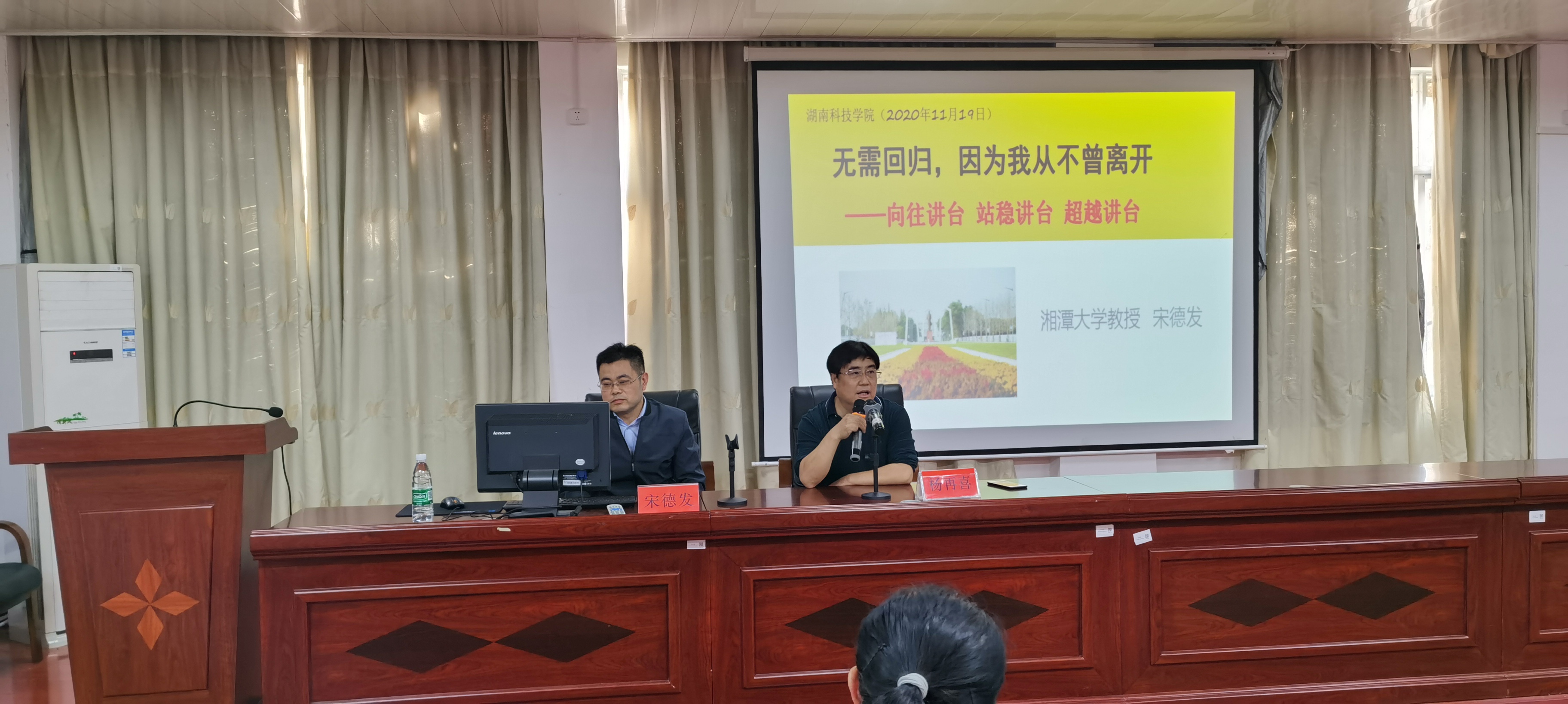 本网讯 11月19日下午,湘潭大学博士生导师、比较文学与世界文学研究所所长宋德发应邀来校作教学专题报告,我校青年教师及永州九中和杨梓塘小学新进教师到场聆听,报告会由教师发展中心主任杨再喜主持。