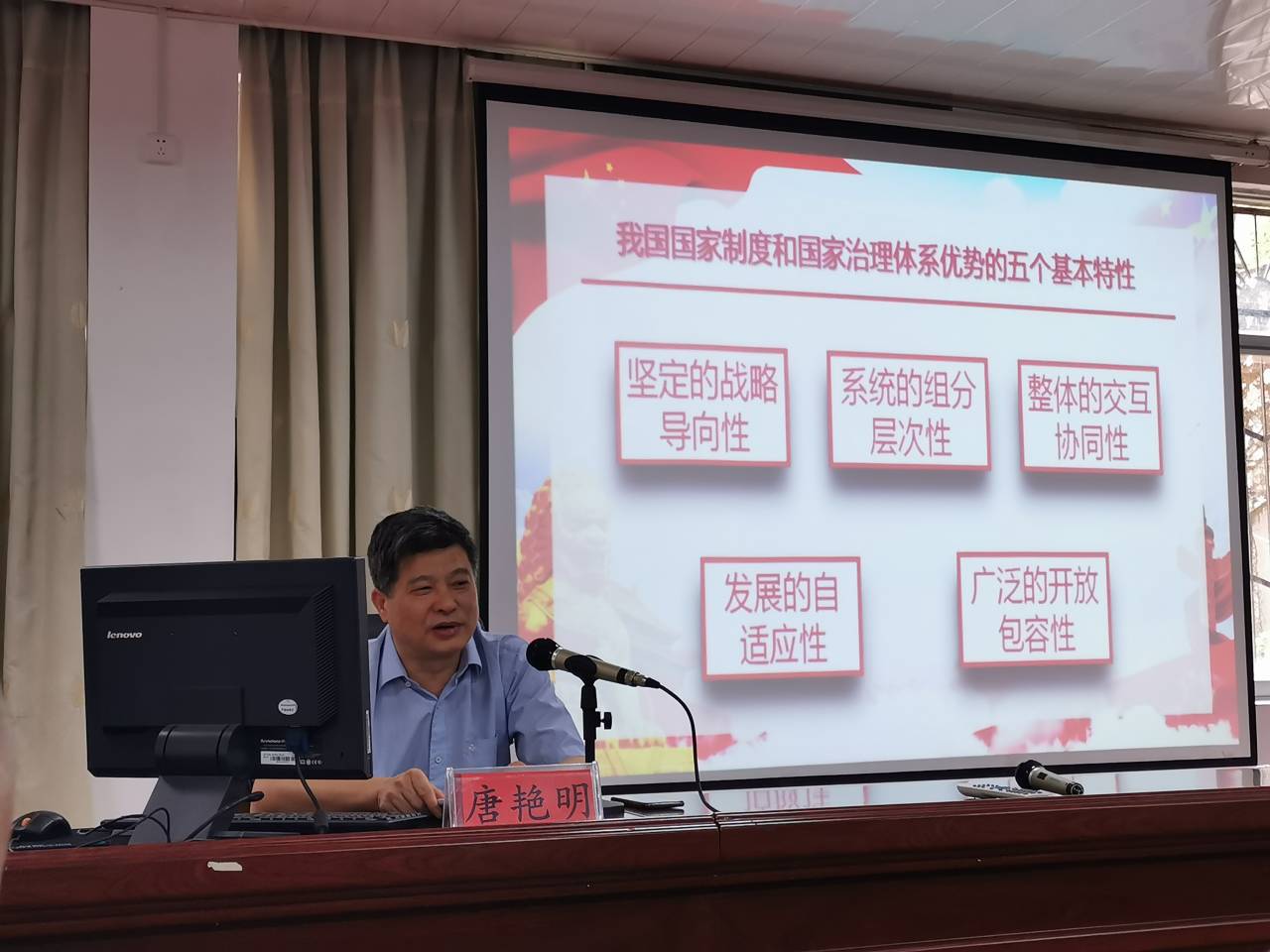 本网讯 6月23日下午,党委副书记唐艳明在知行楼为理学院和电信学院全体教师党员作题为“学习十九届四中全会精神  推进我校治理体系和治理能力现代化”的主题党课,党课由电信学院党总支书记陈泽顺主持。
