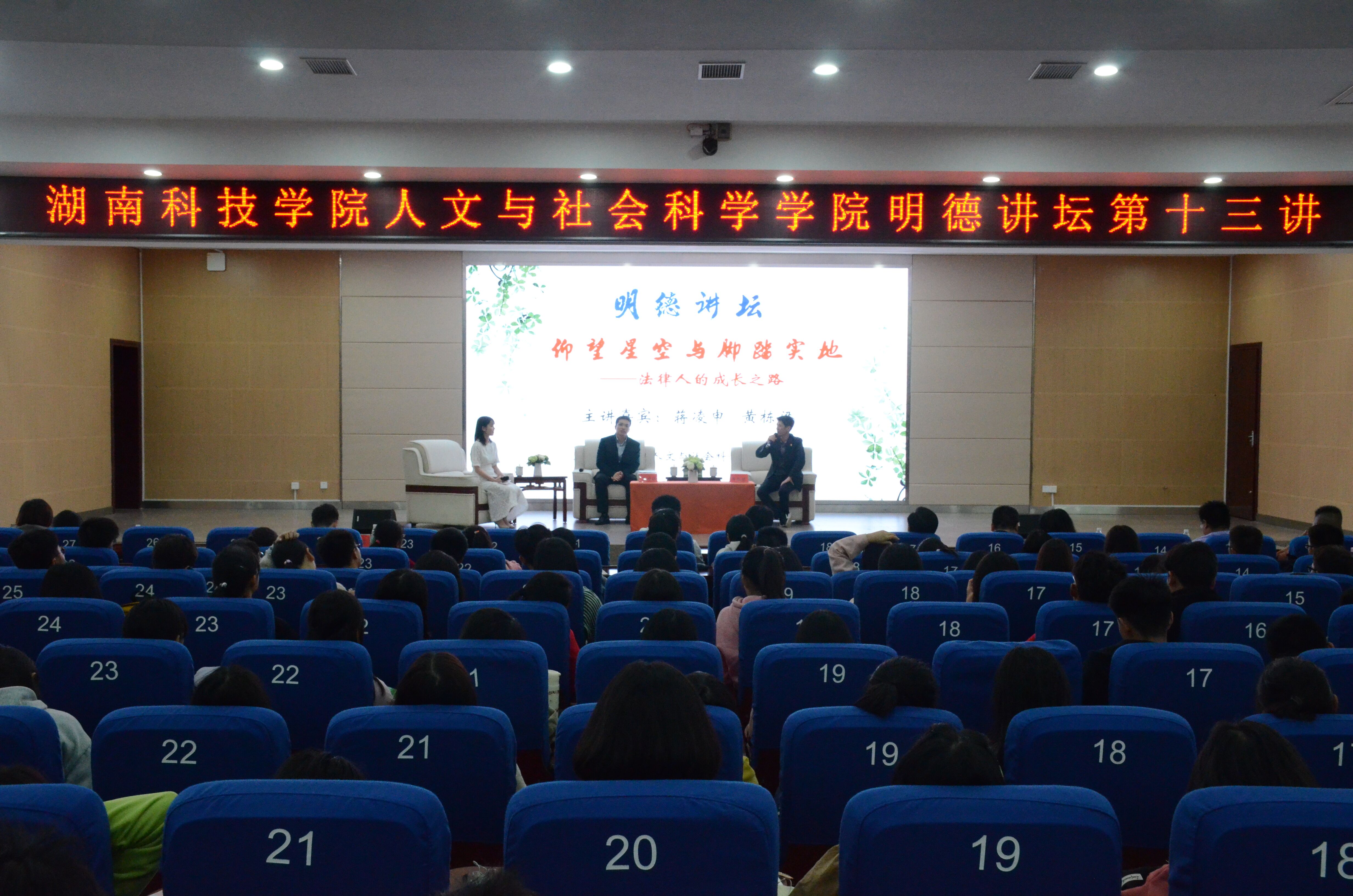 本网讯   11月13日,人文与社会科学学院明德讲坛第十三讲“仰望星空与脚踏实地--法律人的成才之路”在潇湘大讲堂举行。2002级法学专业优秀校友,福州大学法学院硕导、博士后蒋凌申与人文学院副院长黄栋梁博士应邀为学生开讲。该院党总支书记谷显明参加。