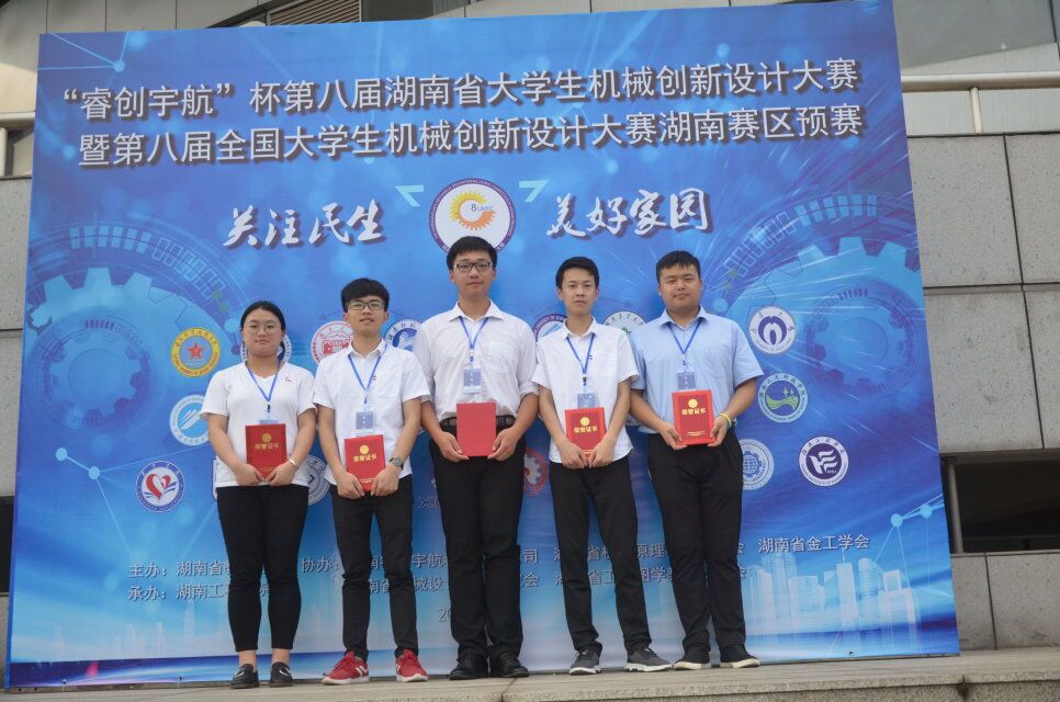 本网讯 5月11日至5月13日,第八届湖南省大学机械创新设计大赛在湖南工程学院举行,来自全省32个院校的248支队伍参赛,我校电子与信息工程学院罗哲、杨文佳老师指导的马雪峰、伍博林、李鑫洋、汤伟明、崔锦雯同学荣获二等奖,实现了我校在该类比赛项目获奖的零突破。
