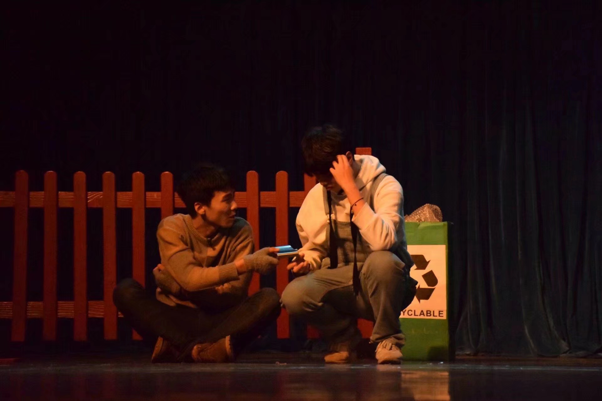 话剧《警察与赞美诗》讲述的是一个穷困潦倒,无家可归的流浪汉苏比,因为寒冬想去监狱熬过,所以故意犯罪,去饭店吃霸王餐,扰乱治安,偷他人的伞,调戏妇女等,然而这些都没有让他如愿进监狱;最后,当他在教堂里被赞美诗所感动,想要从新开始,改邪归正的时候,警察却将他送进了监狱。话剧以喜剧的形式塑造了流浪汉苏比的形象,表现了美国下层社会小人物的悲剧命运。整场演出无论是苏比的心理转变,还是卡尔的懵懂无知都被同学们演绎得淋漓尽致。同学们的精彩演出,赢得了大家的热烈掌声。