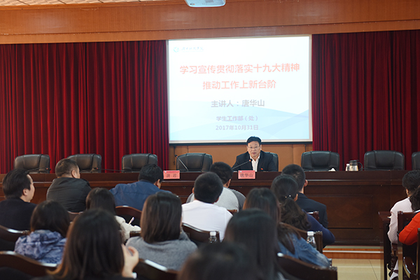 会上,唐华山指出,中国共产党第十九次全国代表大会的胜利召开选举产生了新的中央领导集体,中国特色社会主义进入新时代,习近平新时代中国特色社会主义思想成为我党的指导思想和行动指南,作为从事高校思想政治工作者应该提高政治站位,强化“四个意识”,坚定“四个自信”,自觉用十九大精神和习近平新时代中国特色社会主义思想武装头脑、指导工作。唐华山就学工队伍学习贯彻落实十九大精神提出三点要求。一是改进学风不懈怠,努力成为一个乐于、勤于、善于学习的好老师。要结合实际深入学习十九大精神,在学懂、弄通、做实上下功夫,要在学生中进行宣讲,迅速掀起学习的高潮,让十九大精神和习近平新时代中国特色社会主义思想入心入脑。二是要转变作风求实效。全体学工人员要以强烈的职业认同感和崇高的职业追求,不断提升从事思想政治工作的能力与水平。三是建设队伍促发展。队伍建设是基础、是关键、是保证,要看到新形势下队伍建设方面存在的问题与不足,努力形成相互学习、共同提高、尽展其才的良好局面。
