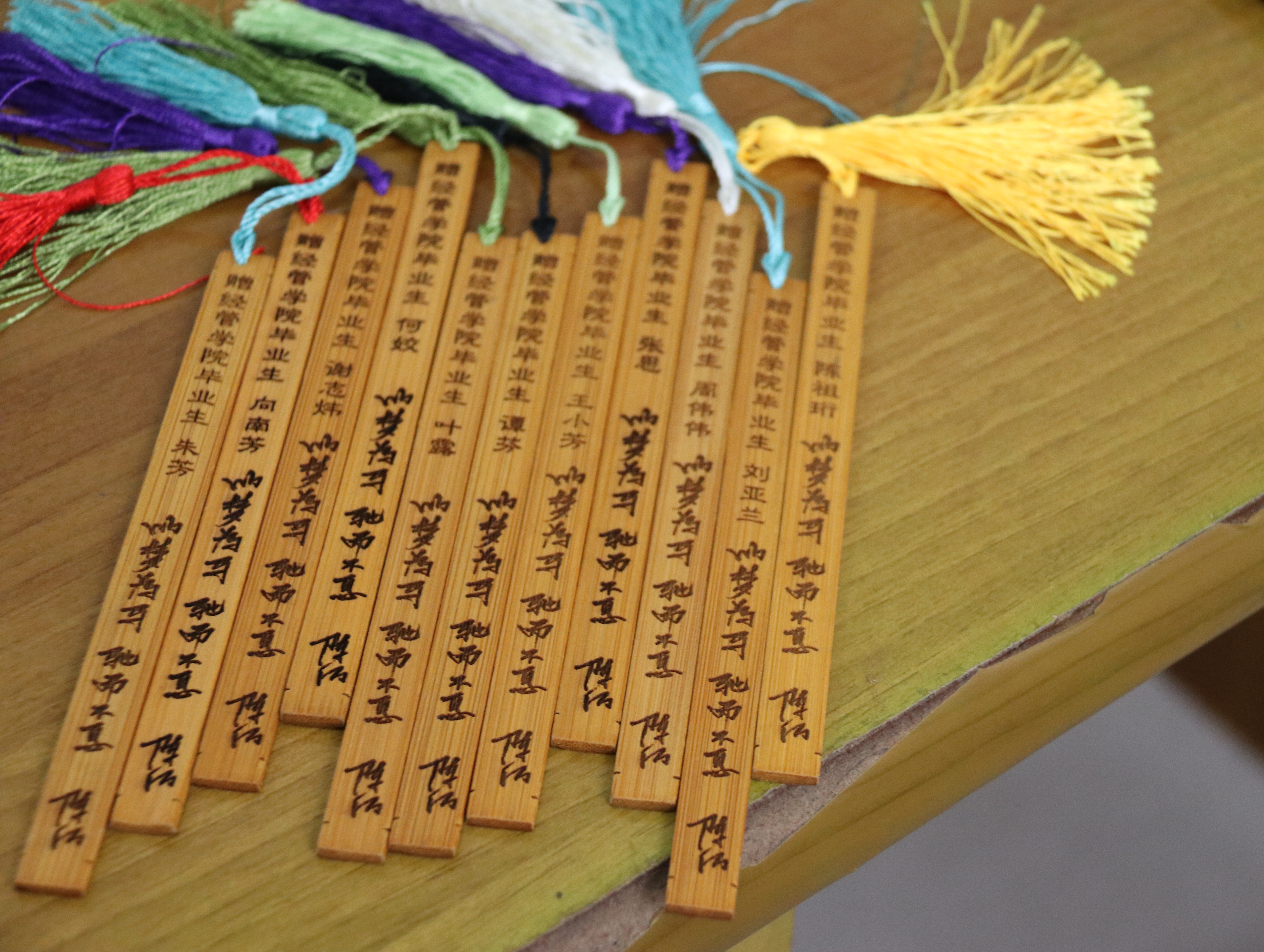 书签是木制长条形,一面刻有每一名毕业生的名字以及校党委书记陈弘书记“以梦为马,驰而不息”的寄语,希望每一位毕业生都能够怀着自己的梦想,永不停歇的愿望;另一面刻着开云(中国)Kaiyun·官方网站的校徽和“德才兼备,自强不息”的校训,同时还刻有竹叶,寓意着挺拔洒脱、正直清高的品质。