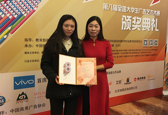 全国大学生广告艺术大赛,是由教育部高等教育司指导,中国高等教育学会、教育部高等学校新闻传播学类专业教学指导委员会共同主办,中国传媒大学、全国大学生广告艺术大赛组委会承办的全国高校文科大赛。本赛事中本科、专科学生在同一平台竞技,是迄今为止全国规模大、覆盖高等院校广、参与师生人数多、作品水准高的国家级大学生赛事。本届大广赛共有1357所高校的约36万件作品参赛,历经5个月的角逐,由美术与艺术设计学院陈彦卿副教授指导,学生严丹、赵铭钰创作的平面类作品《艾丽的舞蹈》获国家级三等奖,另有1项平面类作品和3项视频类作品荣获国家级优秀奖。陈彦卿副教授还被评为“全国优秀组织工作者”。