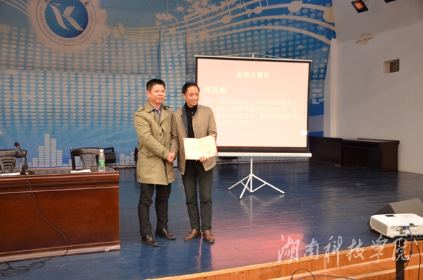 本网讯(通讯员 龙夏萍 王佩莹)为树立正确就业观,助推学子更好就业,解决就业难题。12月10日晚,在音乐学院演播厅举办“就业创业讲坛暨导师聘任仪式”,我校优秀校友、永州市就业服务管理局局长何昌盛应邀主讲。副校长程智开出席讲座。