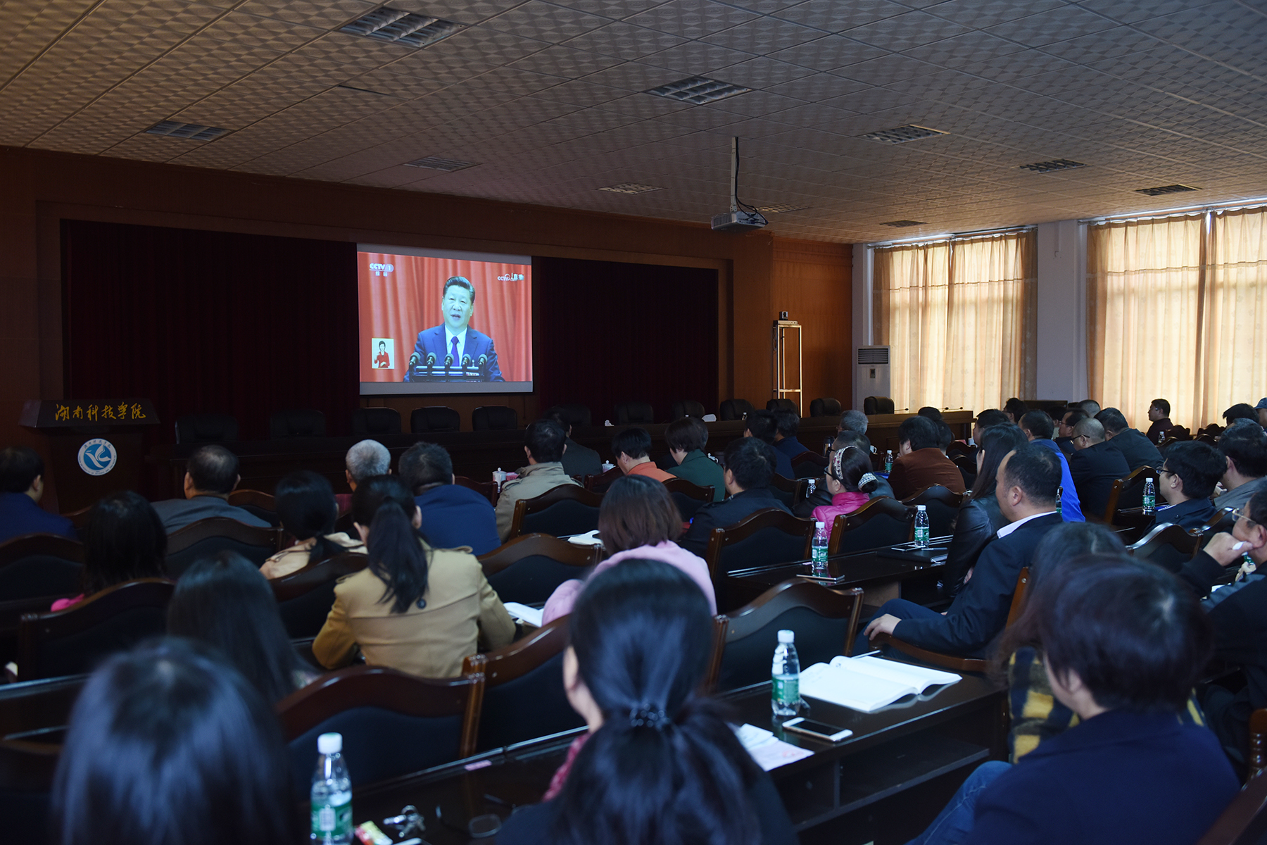 各教学学院分别在多媒体教室、学生宿舍等场所也集中进行了收看。在学校定点扶贫村——新田县龙泉镇潮水铺村,驻村扶贫干部组织村民集中进行了收看。