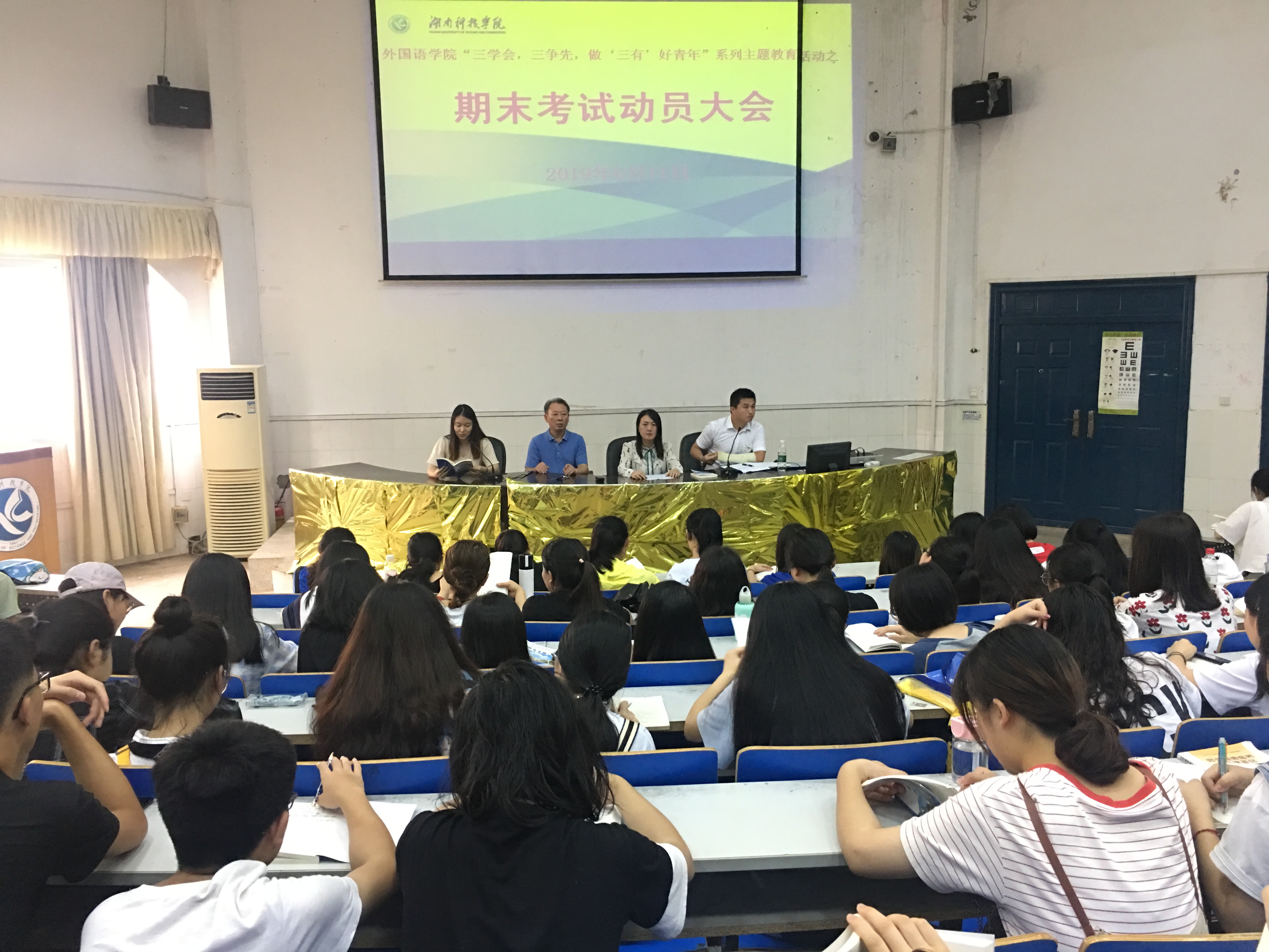 (通讯员杜俊杰)为严肃考风考纪,动员学生做好期末考试准备,6月11日下午,外国语学院召开2019年上期期末考试动员大会。院长欧华恩、党总支副书记罗晶出席会议并发表讲话。外国语学院全体在校学生、辅导员参加会议。大会由学工办副主任、15级辅导员刘罗主持。