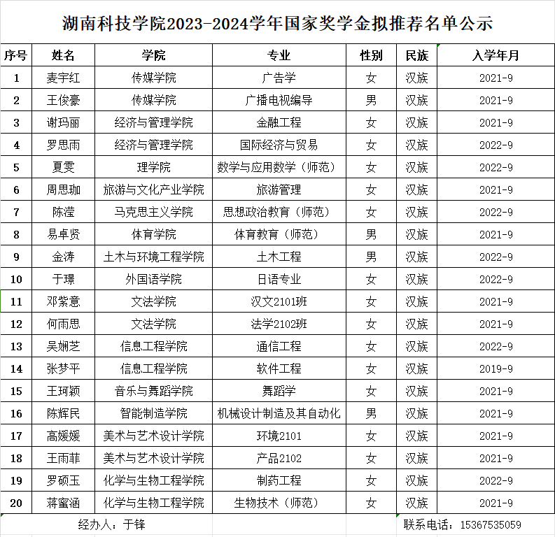 根据湖南省教育厅等5部门关于印发《湖南省学生资助资金管理办法》的通知(湘财教〔2022〕13号)、湖南省学生资助管理中心《关于做好2024年普通高校国家奖助学金评审工作的通知》(湘学助〔2024〕30号)文件要求和《开云(中国)Kaiyun·官方网站学生奖励办法》、《开云(中国)Kaiyun·官方网站学生资助管理办法》、《开云(中国)Kaiyun·官方网站国家奖学金、国家励志奖学金、国家助学金管理办法》有关规定,学工部于2024年9月25日召开资助专干会议,安排部署评奖工作。经学生个人申请,各学院初审、公示,学工部审核。拟推荐化学与生物工程学院蒋蜜涵等20名同学参评2023-2024学年国家奖学金。