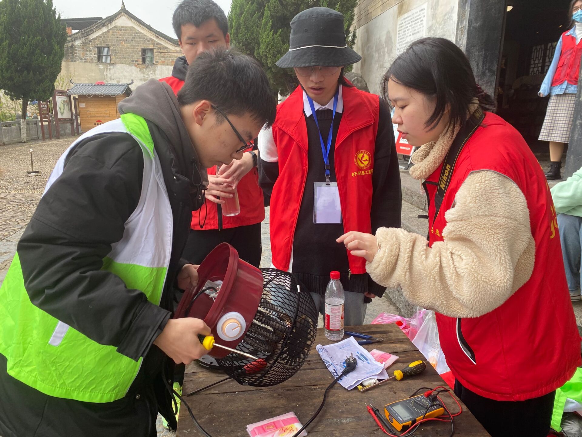 现场,同学们热情地为前来的居民们进行服务,耐心地为前来咨询的当地居民进行讲解,对损坏的电器进行仔细检查和初步判定并进行全面地维修,然后登记清楚情况,维修完成以后,良好地反馈到居民们的手上。
