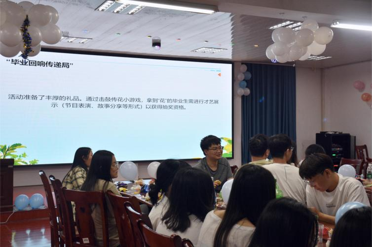 在教学楼门口的心愿打卡区,大家纷纷写下对未来、对母校的快乐期许,与老师和同学留下珍贵的合影;欢送会现场,同学们发挥才艺,载歌载舞,为青春留下最美的瞬间。在“职场盲盒”环节,毕业生在便签纸上写好职场困惑并放入“职场盲盒”,领导随机抽取几个问题结合自身管理经验与行业洞察进行权威解答。“毕业回响传递局”小游戏以击鼓传花的方式点燃全场热情,拿到花的“天选之人”进行才艺表演,师生间笑语盈盈,情谊融融。在“时光寄语”环节,毕业生们在信笺上写下“愿学弟学妹代码零error”“希望学院硕士点更多”“愿成为永远热血的信工人”等创意寄语,既饱含对母校的深情眷恋,更彰显信息工程学子们的专业特质。最后学院为大家送上了喜庆的毕业蛋糕,把活动氛围推向了高潮。大家纷纷表示要做一个热爱母校的人,积极关注母校的发展,以实际行动为母校增光添彩。