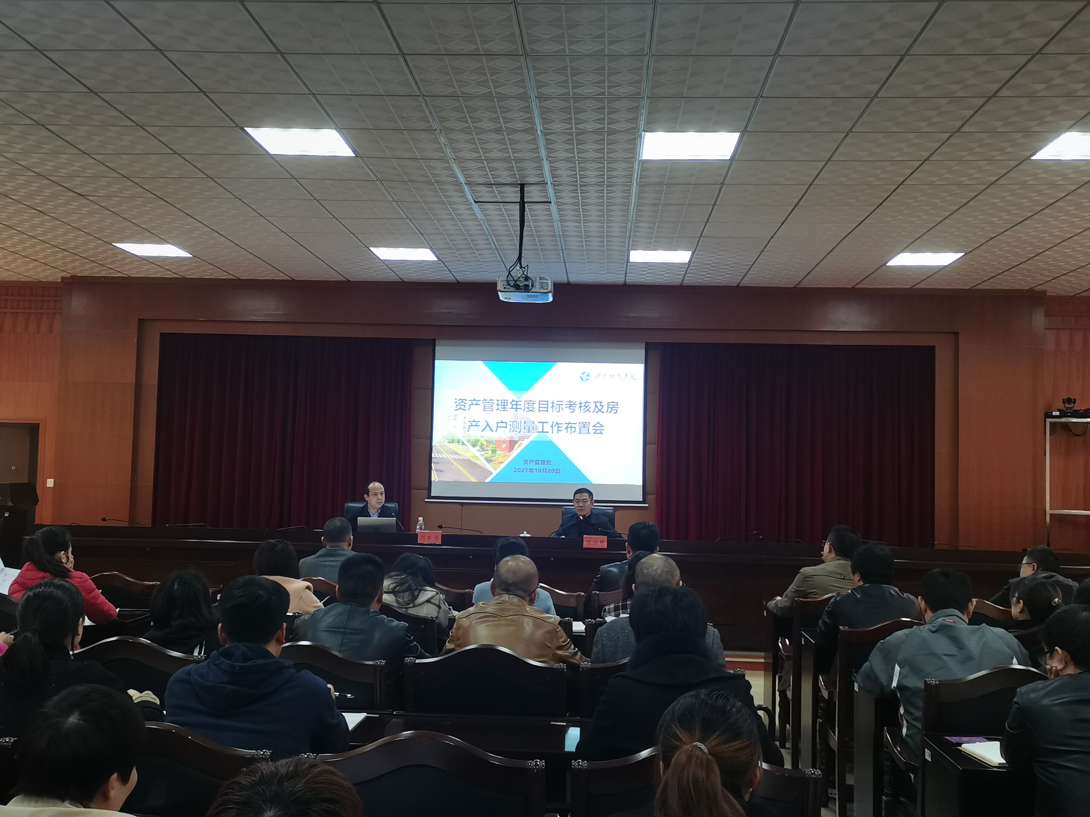 2021年10月20日下午3:00,学校在综合信息楼八楼一会议室召开2021年度资产管理年度目标考核暨房产综合管理系统入户测量工作布置会。会议由吴小林副校长主持,校属各单位分管资产的中层领导及部门资产管理员80余人参会,会议秩序整然。