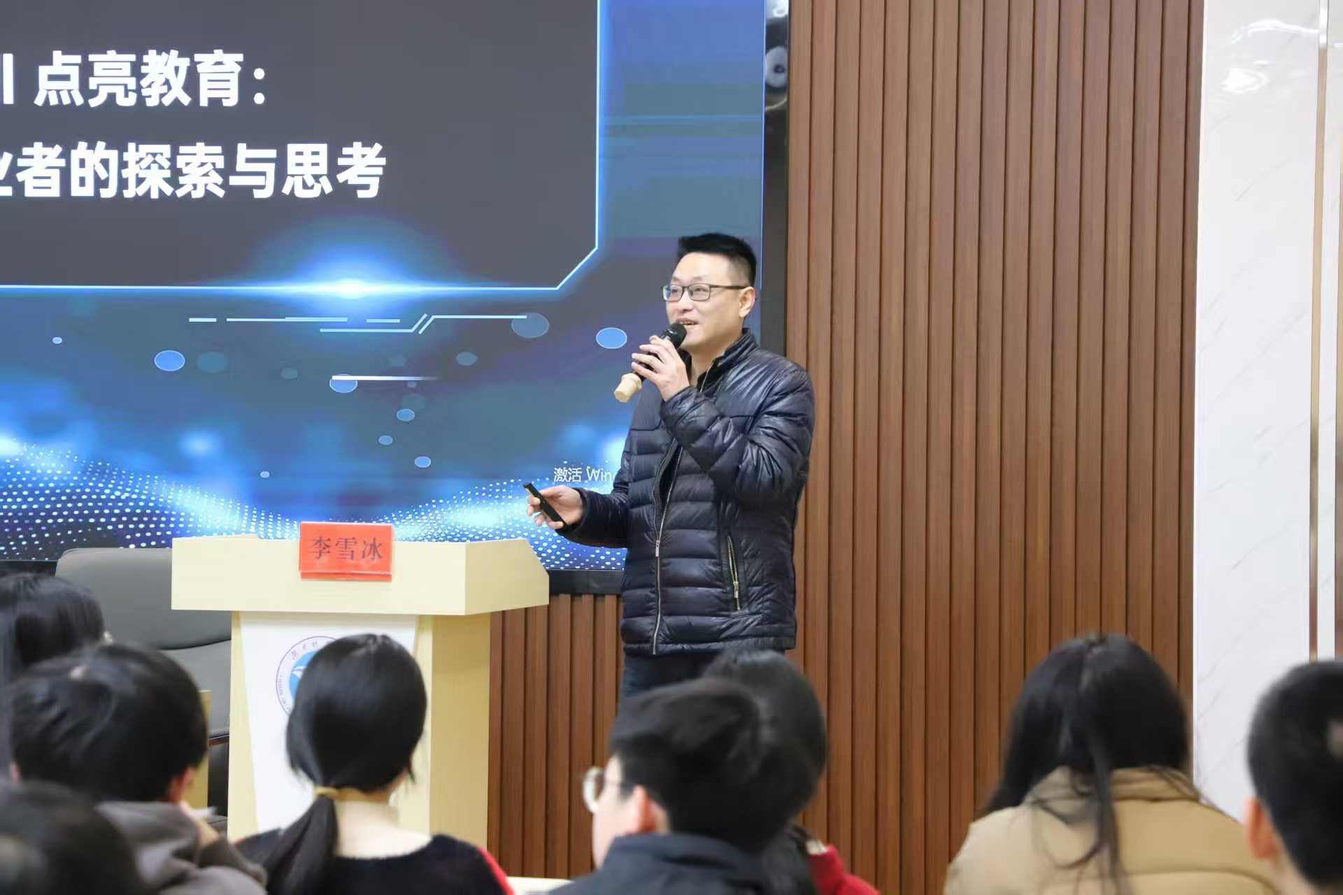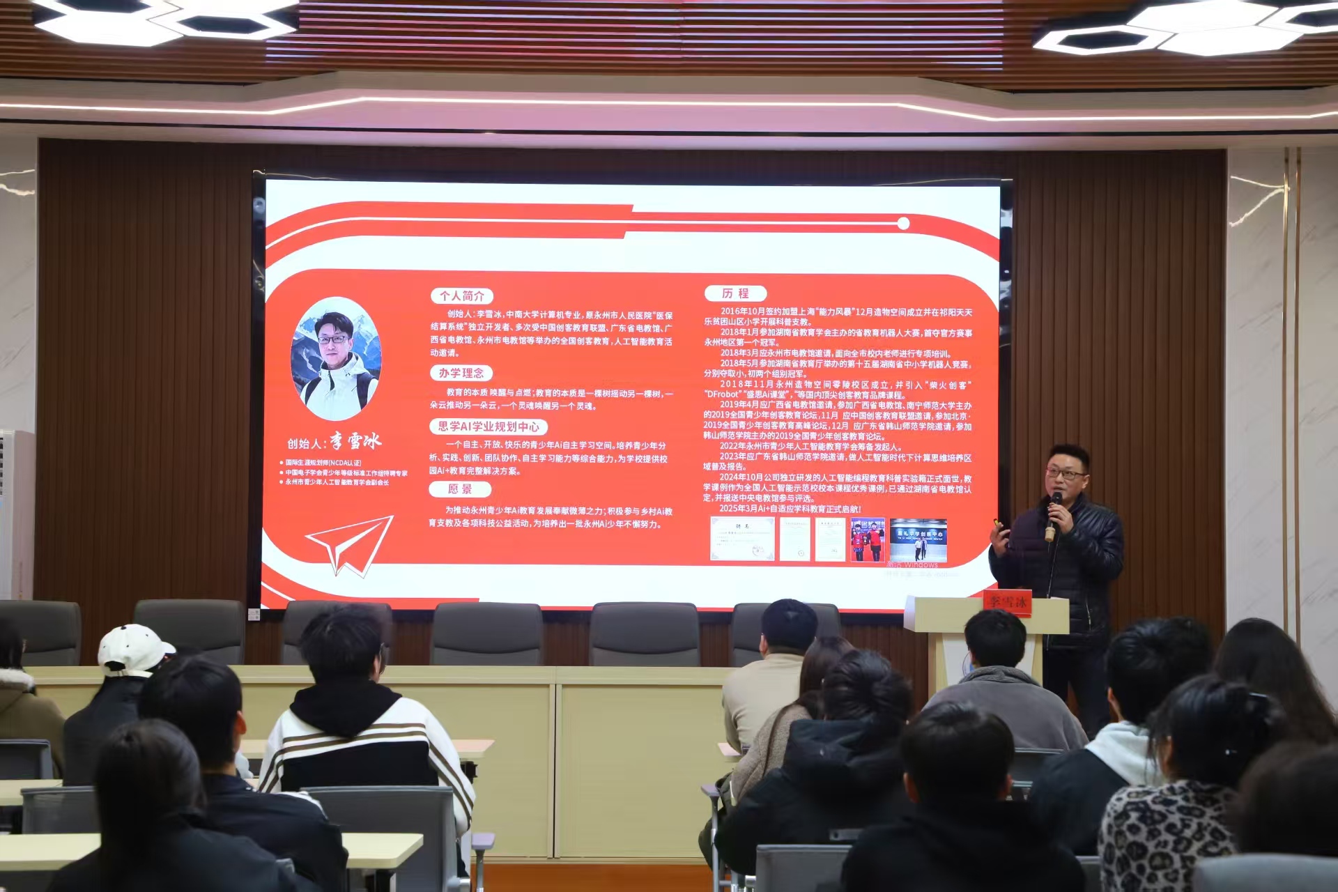 本网讯(记者 刘斌 唐晶 摄影 梁自元)3月12日晚,由学校支持大学生创业工作专班主办的创客训练营首期活动在明理楼101多功能室举行。本次活动聚焦培养“科创客”,由国际生涯规划师、资深创业者李雪冰担任主讲嘉宾,围绕“用AI点亮教育:一位创业者的探索与思考”作主题分享,吸引了来自全校正在创业和有创业想法的100余名学生参加活动。